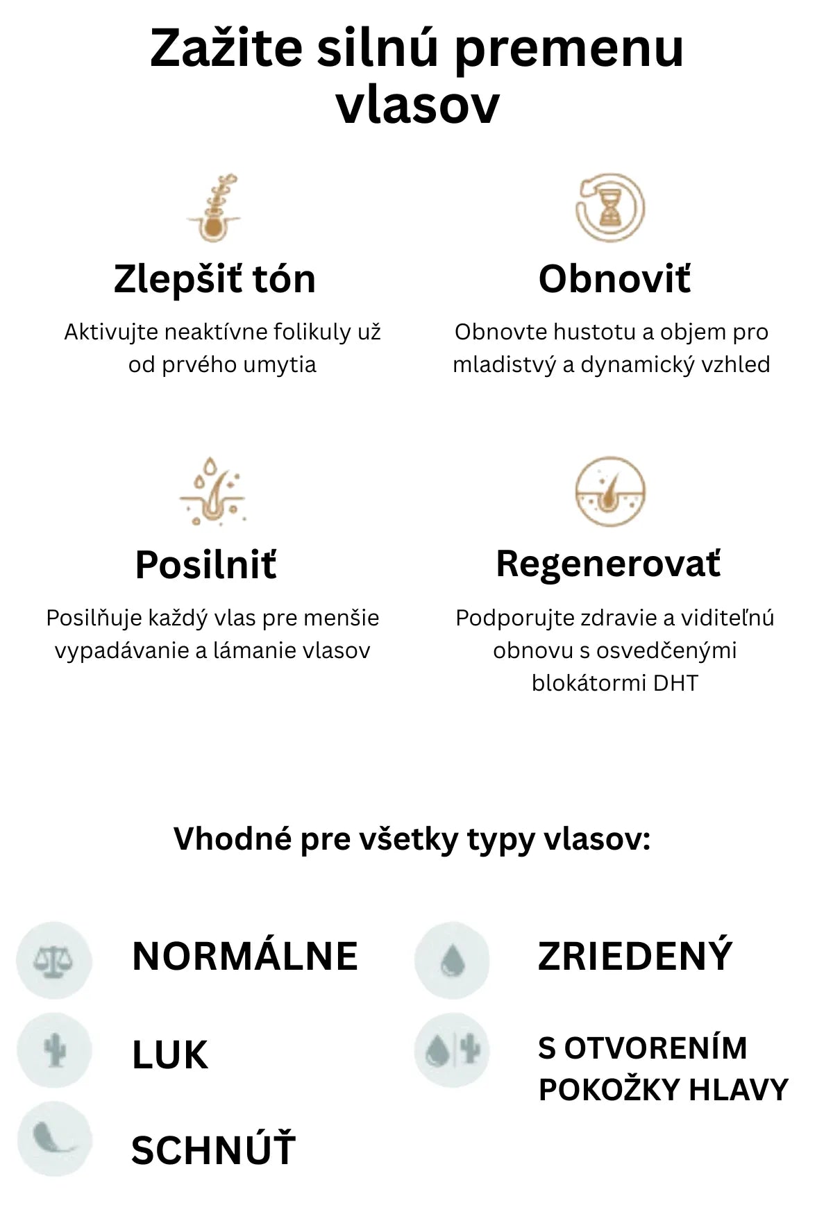 Jednoduchá 90-dňová rutina (2–4x/týždeň), ktorá pomáha bojovať proti miestnemu DHT, zlepšuje mikrocirkuláciu a dodáva vlasom hustší vzhľad. Výsledky sa líšia.